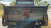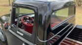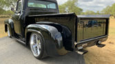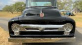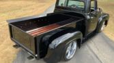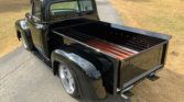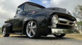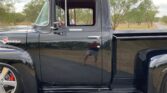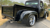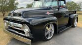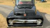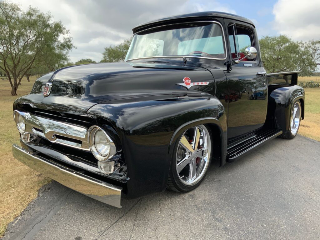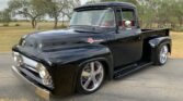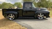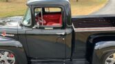 Stunning 1956 Ford F-100 custom pickup in sleek black, powered by a Big Block 454 V8 with Turbo 400 HD automatic transmission. This show-ready truck features a luxurious red custom interior with bucket seats, center console, tilt steering, and digital gauges, plus power steering, tubular A-arms, power front disc brakes, and Vintage Air A/C. Finished with wood bed slats, reverse-opening hood, chrome accents, and subtle fender flames, it combines classic style with modern performance and comfort.
